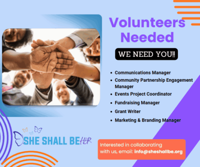 SHE SHALL BE welcomes individuals to become collaborators who leverage their power, privilege, and resources by graciously offering professional expertise, personal experiences, and public acts of sponsorships to educate, enlighten, encourage, and support the positive development of girls, teens and women.